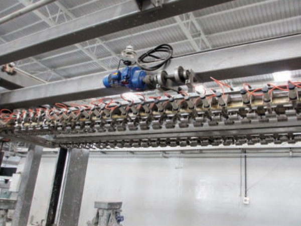 當(dāng)澆注預(yù)養(yǎng)好的模坯在空中翻轉(zhuǎn)90°吊至切割小車,脫去??蚝?,由一部切割小車載運(yùn)至縱切機(jī)、橫切機(jī)工位對(duì)坯體進(jìn)行六面切割。首由縱切機(jī)對(duì)坯體進(jìn)行縱向、水平四面切割,完成后由切割車載運(yùn)坯體停留在橫切機(jī)工位,完成后經(jīng)液壓升裝置上升抬起胚體,一部切割小車退回初始位置準(zhǔn)備運(yùn)載下一模胚體,以備切割。二部切割小車行至橫切機(jī)位置,液壓升裝置下降將坯體放至二部切割小車上,然后由橫切機(jī)對(duì)坯體進(jìn)行垂直切割,切割完成后仍由二部切割車運(yùn)載坯體運(yùn)行至半成品吊具下方,由半成品吊具將坯體吊到蒸養(yǎng)車上做預(yù)編組。切割周期約4. 5min.